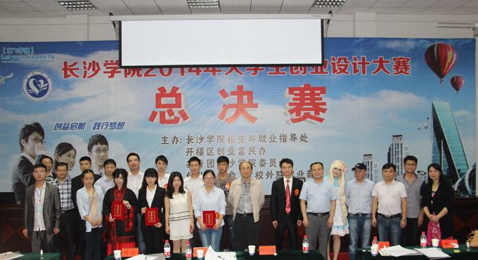 为培养大学生创新精神,激发大学生创业热情,5月22日晚,由长沙学院招生与就业指导处、开福区创业富民办、校团委联合主办的2014年大学生创业设计大赛总决赛在学术报告厅举行。长沙市委统战部副部长、市工商联党组书记、市创业富民领导小组组长饶福明,长沙市工商联副主席、市创业富民领导小组副组长傅纯,长沙市开福区创业富民办副主任刘胜昔,川淇文化有限公司董事长、长沙市开福区工商联合会副主席周川淇,湖南新力源科技有限公司执行董事、湖南乐融投资有限公司总经理、长沙市青年创业者商会副会长周廷瑞,长沙健硒生物科技有限公司董事长、长沙隆农农业科技开发有限公司总经理游勇担任大赛评委。招生与就业指导处副处长邓扬学致欢迎词。