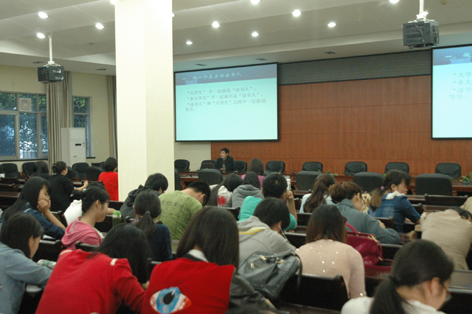 余三定教授从读什么书、为什么读书和做一个怎样的读书人三个方面阐释了"大学生如何读好书"的问题。他揭示了"读好书"的内涵不但是"好好读书",而且是"读好的书",并建议同学们多读纸质书,选择好书读,提倡阅读经典名著。他提出了"大学生不一定是读书人,非大学生不一定不是读书人"的观点,并通过引用大量文人墨客的例子来佐证"真正的读书人应该以读书为快乐,自觉阅读专业以外的书籍,喜欢藏书,能写作"这一观点。余教授还与在座师生讲述了发生在他家 "南湖藏书楼"的趣事,分享了藏书的经验。