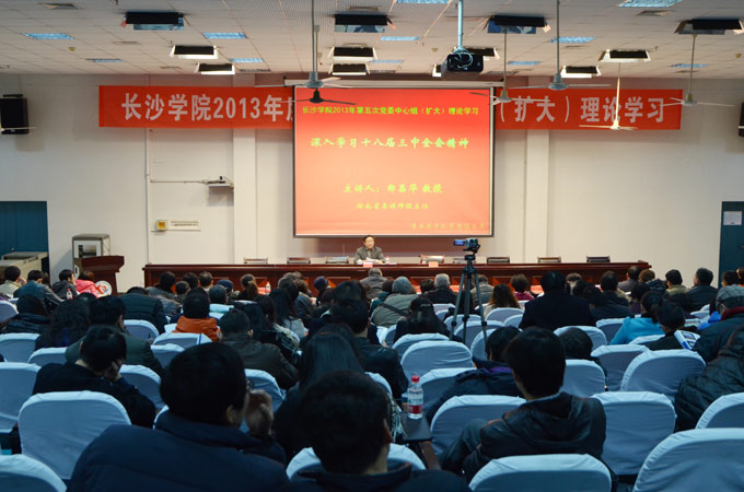 12月27日下午,我校在致远楼学术报告厅举行2013年度第五次党委中心组(扩大)理论学习会议。校领导詹小平、韦成龙、屈林岩、陈大川、杨兴龙,全体中层干部,教工党支部书记、全体学生辅导员、团学干部等300余人参加了报告会。湖南省委讲师团主任郑昌华教授应邀就"十八届三中全会精神"作辅导报告,会议由党委书记詹小平主持。