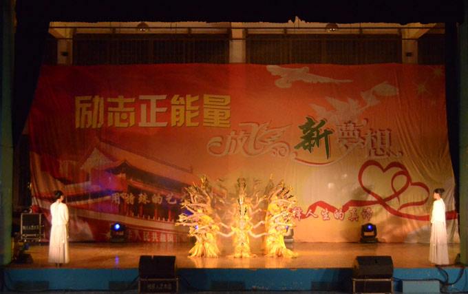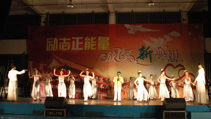 演出在一支喜气洋洋的《中国范儿》舞蹈中拉开帷幕。虽然已是寒冬,但艺术团的热情点燃了整个体育馆。整场演出的表演形式丰富多彩。盲人歌手饱含深情地演唱一曲《老师》,随后展示了高音萨克斯曲《西班牙斗牛士》,可谓中西结合,多才多艺。之后,聋人表演者们献上了大型舞蹈《黄土黄》,男子的阳刚之美与女子的阴柔之美在舞蹈中完美结合,令人惊叹。更有失臂表演者以口代手,写下了"力学笃行"四个刚健有力的大字。这四个字不仅体现了长大精神,更体现了残疾人士不向生活低头的刚强性格。在主持人的介绍下,我们了解到一位来自贵州的残疾表演者因为救一个在铁轨上玩耍的孩童而被夺去了左臂。但他并不后悔这么做,他说:"一条胳膊换一条命,值了!"这样的感人事迹深深地触动着在场的每一位同学。最后,整场演出在《千手观音》这个不朽的神话里落下帷幕。
