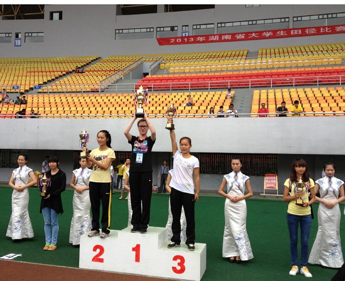 6月4日至9日,2013年湖南省大学生田径锦标赛在衡阳师范学院隆重举行。我校体育健儿勇夺本科学院组男女团体总分第一名,女子团体总分第一名,男子团体总分第二名。同时,以15枚金牌、7枚银牌、3枚铜牌取得了金牌总数、奖牌总数第一名,实现了自2005年我校参加省大学生田径锦标赛以来的男女团体总分、女子团体总分、金牌总数、奖牌总数七连冠。