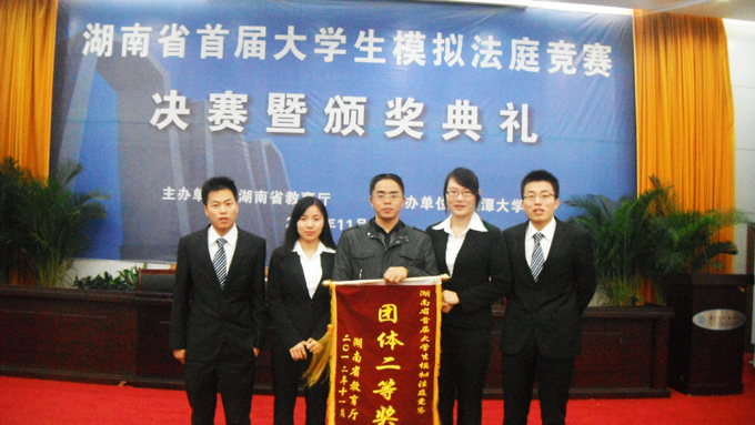 11月17日-19日,湖南省首届大学生模拟法庭竞赛在湘潭大学隆重举行。本次大赛吸引了全省本科高等院校的30支代表队报名参加,我校派出的由谭雄斌、王泽众、喻孟良、赵红玲等四位同学组成的代表队,在刘福泉老师的带领和指导下,一路过关斩将,最终荣获本次大赛"团体二等奖",赵红玲同学荣获"最佳辩手"称号。