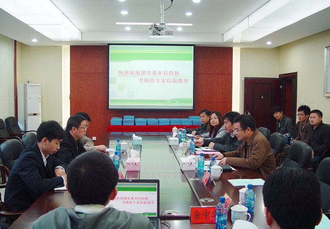 李云龙代表我校致欢迎辞,对莅临我校的考核小组表示热烈的欢迎,并从师资队伍、人才培养、教学科研等方面简要介绍了我校办学基本情况以及党委对共青团的领导与支持情况。随后团委书记薛平平以"大力开展实践活动,全面推进五项工作"为主题介绍了我校团学工作的具体情况。他表示:"紧扣主题,创新形式,加强大学生思想政治教育"、"强化队伍,健全体制,不断规范组织自自身建设"、"加强培训,注重实效,推进服务大学生就业创业打造平台"、"营造氛围,积极推进大学生科技创新"和"培育特色,提升水平,进一步加强校园文化建设"这五个项目都取得了较好的成果。同时也对2011年我校共青团开展的主要活动与其成绩及工作中的不足和改进措施两个方面作了汇报。