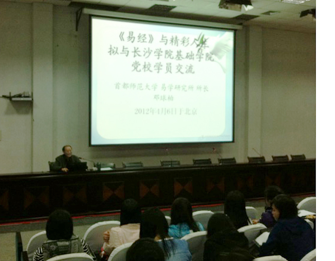 4月12晚,首都师范大学博士生导师、易学研究所所长邓球柏教授在致远楼学术报告厅为基础学院入党积极分子及部分同学进行了题为"易经与精彩人生"的精彩讲座。校党委副书记、副院长、党校校长李云龙出席了此次讲座。讲座由基础学院党总支书记谷建春主持。