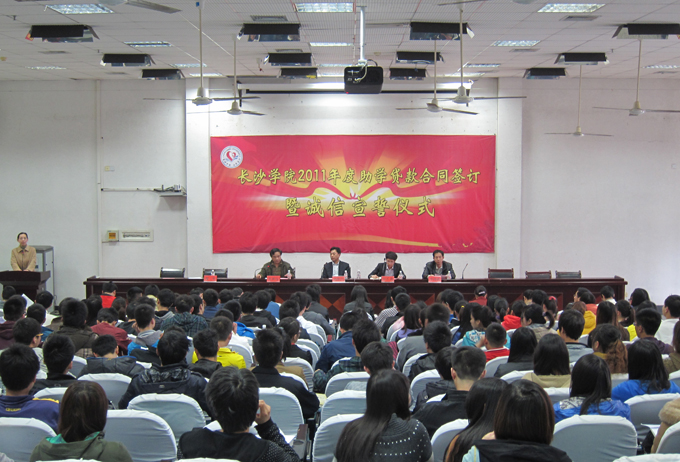 为进一步加强大学生思想政治教育,提高大学生诚信意识,我校于3月27日下午在致远楼学术报告厅隆重举行"2011年度助学贷款合同签订暨诚信宣誓仪式"。出席仪式的领导和嘉宾有:长沙学院副院长刘世昌,国家开发银行湖南省分行贷款专员郭长鑫、谢斯颍,学生工作处、校资助中心负责人以及各系负责奖助工作的辅导员老师。