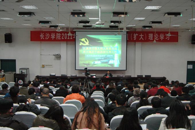 1月10日下午,我校2011年第四季度党委中心组(扩大)理论学习在致远楼学术报告厅举行。中共长沙市委组织部副部长陈芳辉应邀作了题为《认真学习选人用人政策法规 努力做好干部选拨任用工作》的专题报告。校领导黄中瑞、刘耘、李云龙、钟惠英、郭清泉、雍正海、王永宏、刘世昌、陈大川,全体中层干部、教工党支部书记参加了报告会。会议由李云龙主持。