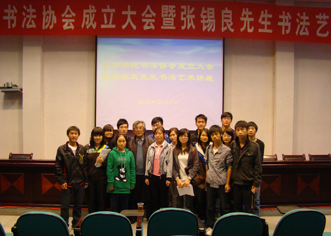 余文龙宣读了《长沙学院书法协会教工分会章程》(草案)及理事会成员名单(建议名单)并就书法协会成立的目的、意义及今后构建书香校园的工作设想做了发言。通过表决,大会一致通过了协会章程和理事会成员名单。省书法家协会会员、图书馆周漾澜老师担任主席。邹常伟、张建龙、余文龙、贾兰、谢立辉、邹安全、许彦担任副主席,协会隶属校工会主管,下设秘书处、组织部、宣传部、实践部和教学部,秘书处设校工会办公室。协会还特别邀请院长刘耘教授、原校长李峻教授担任顾问,李云龙教授担任名誉主席,我国著名书法家张锡良先生受聘担任协会艺术顾问。随后,书法协会新任主席周漾澜为张锡良先生颁发了艺术顾问的聘书并主持了张锡良先生书法艺术讲座。此次讲座为教务处主办的"大学生素质教育"系列讲座之一。