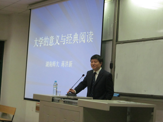 11月5日晚7点,湖南师范大学副校长、外国语学院博士生导师蒋洪新教授在我校涵虚楼B多3教室为我校学生作了一场题为"大学的意义与经典阅读"的讲座。外语系部分老师和学生参加了讲座,讲座由外语系主任熊力游主持。