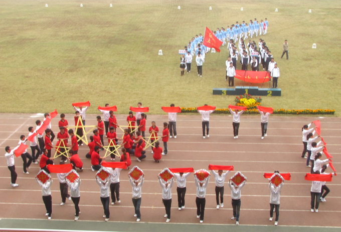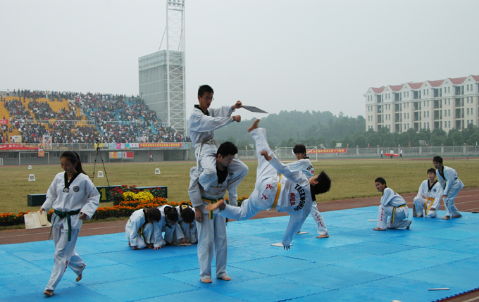 口号嘹亮,青春豪气喻于行。迈着矫健的步伐,包括裁判员方阵队和继续教育学院方阵队在内的14支方阵队英姿飒爽、精神抖擞地依次通过主席台。各方阵队结合本专业特色,将队伍变换得活灵活现,为开幕式又添精彩一笔。土木工程系方阵队手拿彩球,变换出"土"、"木"二字,尽显系部风采;中文与新闻传播系更是别出心裁,利用彩带和绸缎拼出一面五星红旗,表达对祖国的礼赞;计算机科学与技术系衣服颜色鲜艳,变换出 "I""T"二个字母后,迅速展开横幅,高呼对系部、对学校的祝愿。形式多样的方阵队赢得了在场观众的阵阵掌声。与军训阅兵式上严肃氛围不同,此次开幕式的表演简约而不失活泼,开拓了我校运动会开幕式的新风。秉承我校一贯传统,热情洋溢的啦啦舞,张弛有度的跆拳道,精彩纷呈的武术秀更是为开幕式锦上添花。