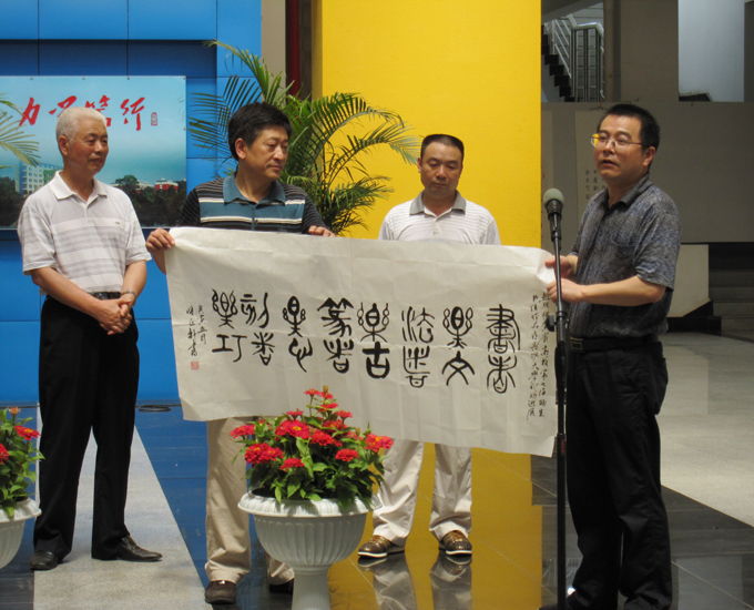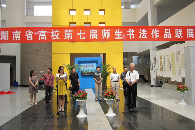 李云龙在致辞中简要阐述了对书法文化的理解,将学习书法的历程总结为"书者乐文、法者乐古、篆者乐心、刻者乐巧",并做了精炼的阐释,同时,他对高校书协为此次联展做出的准备工作表示了衷心的感谢。书协艺术家蔡德林表示,高校是书法发展的一个良好平台,此次书法联展将促进书法在高校的发展,丰富师生的文化生活,他还就书法在高校的发展给予了建议。高校书协主席王元建为我校授予了"湖南省高校第七届师生书法联展优秀组织奖"的奖章。王元建、蔡德林、王希俊、苏美华为此次联展剪彩。最后,艺术系党总支书记胡嫔宣布此次联展开幕。