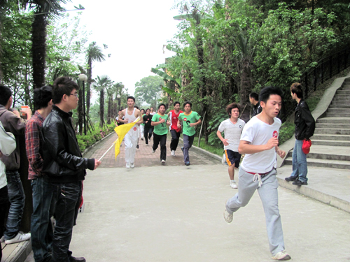 本次环校比赛在新校门拉开帷幕,比赛分为男女两组,共有600人参加,其中男子组360人,女子组240人,全程约7000米。比赛中,男选手尽显男儿本色,175名选手在规定的30分钟内到达终点。曾在去年校运会上夺得男子组10000米和5000米第一的易鹏飞更是以12分56秒的好成绩当仁不让夺得冠军。女子组的成员秉着"坚持到底,我能行!"的信念跑完全程。来自机电系的选手吴娜梅展现了去年在校运会女子5000米长跑中夺冠的风采,一路驰骋,最终以17分40秒的佳绩夺得女子组冠军。