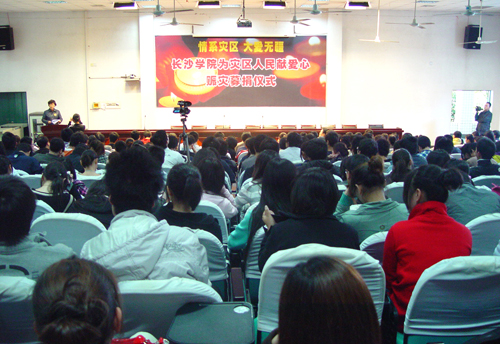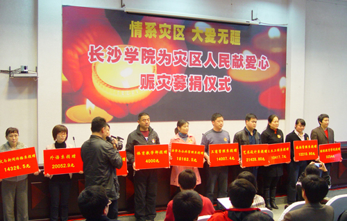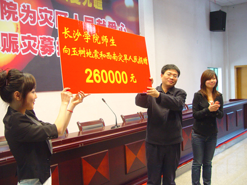 "让我们用爱来温暖,用情来慰籍,为西南的灾区,为劫后的玉树献上我们微薄的心意,携手传递力量,为祖国加油!" 4月23日下午,我校将为西南旱区、玉树地震灾区募集到的26万元善款的善款悉数转交给长沙市慈善总会,交接仪式在致远楼学术报告厅举行。