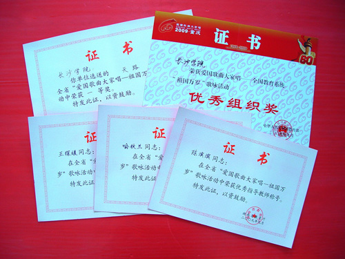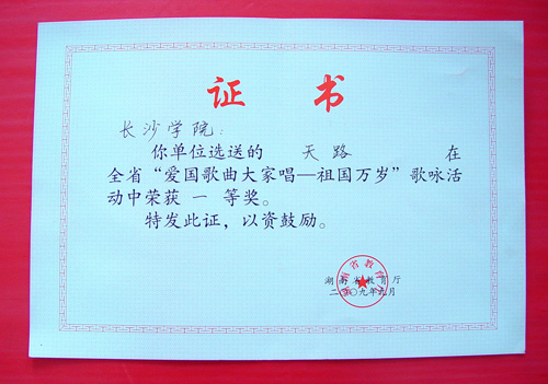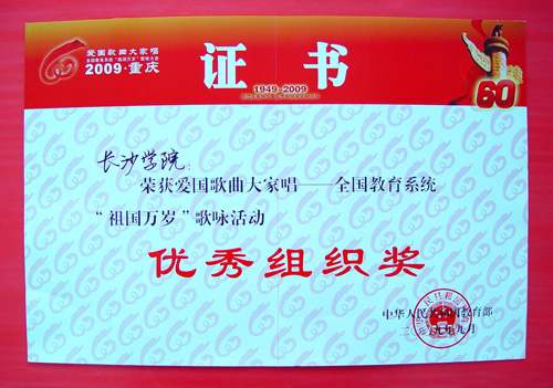 功夫不负有心人,在与湖南师范大学等老牌本科院校同台竞技的条件下,我校选送的合唱《天路》力挫群雄,在省教育厅举办的"爱国歌曲大家唱--祖国万岁"歌咏活动获得一等奖,我校喻秋兰、聂卫华、陈滨滨、王琛媛四位指导老师也荣获"优秀指导教师"荣誉称号,而在接下来的由教育部举办的在"爱国歌曲大家唱--全国教育系统‘祖国万岁’歌咏活动"集中演唱活动中,我校又荣获"最佳组织奖"荣誉称号。