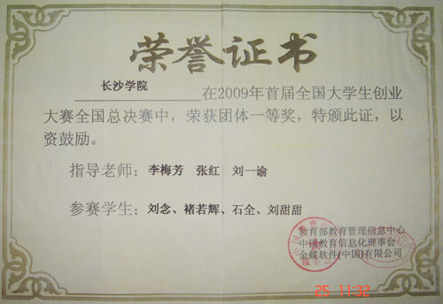 2009年8月1-3日,由教育部教育信息化理事会与金蝶软件(中国)有限公司共同主办、深圳大学承办的"2009金蝶杯全国大学生创业大赛"总决赛在深圳隆重举行。本次全国大学生创业大赛采用创业之星的"电子对抗系统"和"创业计划书" 相结合的形式。经过校内选拔赛、省市预选赛和区域半决赛的层层历练,来自全国各赛区61所高校的由本科生和研究生组成的晋级参赛队进行了为期三天的巅峰对决。由我校工商管理系李梅芳、刘一瑜、张红三位指导老师和06级财务管理专业刘念、褚若辉、石全、刘甜甜、舒枫、朱园园六位学生组成的长沙学院代表队凭借较强的实力和团队合作精神夺得了"2009年金蝶杯全国大学生创业大赛"一等奖。我校学生的创业计划书--嵌入式网络市场调查公司,因创意好,设计思路新,具有创业开发前景而获得评委青睐,夺得了最佳创意奖。我校指导老师获得了最佳指导老师奖。我校代表队凭借出色的专业技术水平,创新能力,演讲能力和较强的团队合作精神征服了大众评委,获得了十佳网络团队人气评选第三名的成绩。
