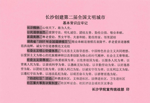 (作者:高泽鹏 郭宇霞) 报到当天,新生和家长们的手中除了录取通知书和入学必须的相关单据外,还多了一份由校宣传统战部精心编排的宣传单。宣传单里主要介绍了长沙精神、公民道德规范 、湖南省2007年度全国道德模范人物等长沙市创建全国文明城市的相关知识。许多新生和家长对此充满了极大的兴趣,他们在认真阅读宣传单后,还向发放宣传单的校报记者们询问我们学校迎接文明城市创建的相关事宜。长沙本地的学生家长们在听完介绍就对记者竖起了大拇指。一些外地的学生笑笑对记者说:"从现在起,我也算半个长沙人了,长沙迎接全国文明城市的评比我能参与进来,我感到很自豪。"