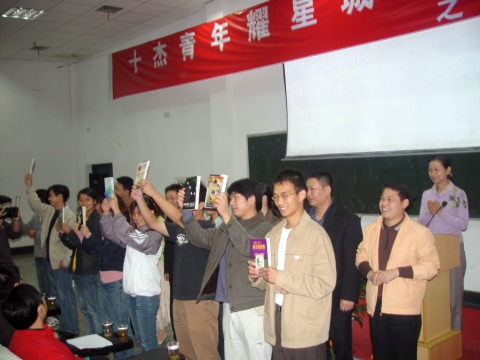 报告会上,"十杰青年"候选人代表做了精彩的发言。他们与我校学子面对面,讲述了他们艰辛的成长历程,同大家一起分享他们的经验和体会,其执着奋斗的精神,感染了在场的每一位听众。来我校的15位"十杰青年"候选人还各自选了一本自己最珍爱的书赠与我校学生代表,激励我校学子奋发进取,刻苦钻研,在实践中磨练自己,创造美好的人生。