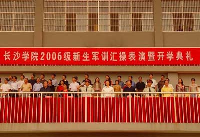 在庄严的阅兵式进行曲中,在王立章大校的陪同下,李咏芳书记对来自十二个系的二十七个方队进行了检阅。一声声嘹亮的“首长好”、“为人民服务”响彻体育场上空。接下来,各方队踏着整齐的步伐,喊着嘹亮的口号从主席台下渐次走过,以勃发的英姿展现了06级新生朝气蓬勃、积极进取的精神面貌,他们精彩的表演赢得场上阵阵如潮的掌声。各方队归队后,钟志明上校、李云龙副书记以及教师代表李映辉教授发表了讲话,他们对同学们在军训中的精彩表现给予了高度评价,并对同学们未来的大学生活寄予了殷切期望。随后,老生代表涂妙妙同学和新生代表彭璐媛同学也作了发言,她们用自己的真实感受告诉大家她们在长沙学院这个大家庭中的所得所感。