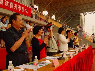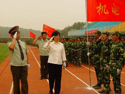 9月29日下午,在我校新体育场隆重举行了2006级新生军训汇报演出暨开学典礼。李咏芳、李云龙、钟惠英、邓球柏、屈林岩等校领导和国防科技大学指挥军官基础教育学院副院长王立章大校、二大队副大队长钟志明上校出席了此次典礼。各部门负责人和各系辅导员、各班班主任和班导列席观看了汇报演出。副院长钟惠英主持典礼。