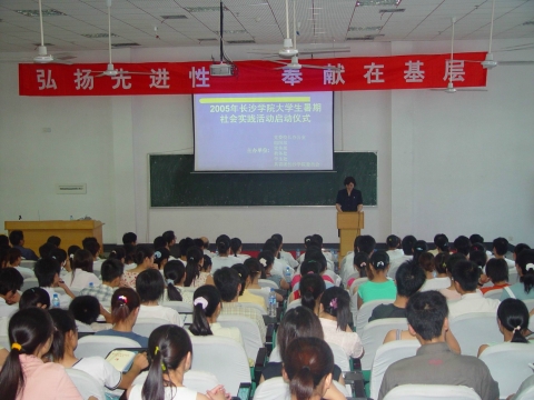 7月15日,长沙大学2005年暑期大学生社会实践活动启动仪式在科技楼学术报告厅隆重举行。今年长沙大学组建了九支社会实践服务团,每个团队中有半数以上是学生党员,这是历年以来阵容最强、学生党员参与人数最多、活动内容最丰富的一次有组织暑期社会实践活动。