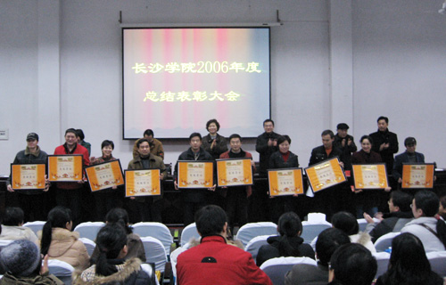 表彰大会由院长刘耘主持,校领导李咏芳、李云龙、钟惠英、熊国璋、方逵、刘世昌及全体教职员工参加了此次会议。党委副书记、副院长李云龙宣读了《中共长沙学院委员会、长沙学院关于表彰2006年度先进单位的决定》和《中共长沙学院委员会、长沙学院关于表彰2006年度先进个人的决定》。外语系等十个单位被评为“长沙学院2006年度先进集体”,唐依民等102位同志获“长沙学院2006年度先进个人”荣誉称号。