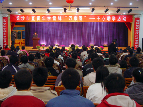“千心创和谐,万家迎新春”, 3月10日,长沙市直青年学雷锋“万家春——千心助学”活动在我校教师学生活动中心温暖启航。中共长沙市直机关工委、长沙市政府办公厅、长沙市商业银行、长沙市建委、长沙市公安局、长沙市民政局、长沙市国税局、长沙市地税局、长沙市交通局(公路局)、长沙市机关事务局、长沙市环路公司、长沙市规划信息服务中心等12家单位让我校60名品学兼优的贫困学子真切地感受到来自他们的浓浓爱心。