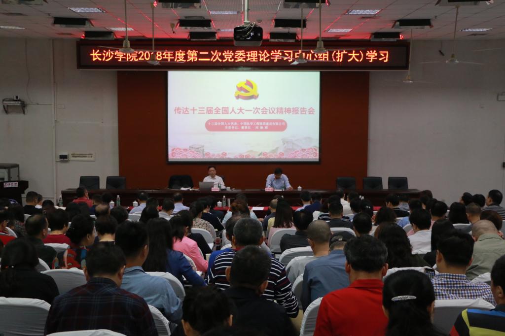 为深入学习贯彻2018全国“两会”精神,5月4日上午,我校在致远楼学术报告厅组织了2018年第二次党委理论学习中心组(扩大)学习。第十二届、十三届全国人大代表,中国化学工程第四建设有限公司党委书记、董事长,享受国务院特殊津贴专家、全国劳动模范刘德辉应邀作十三届全国人大会议精神辅导报告。全体校领导、全体中层干部、党支部书记、教研室主任、马克思主义学院教师和全体辅导员参加了学习。党委书记韦成龙主持学习报告会。