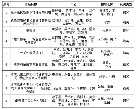 本届大赛以“同创青春,共赢未来”为主题,下设创业计划竞赛、创业实践挑战赛和公益创业赛三大主体赛事。大赛自今年3月启动,全省有38所高校的337件作品入围决赛。经过激烈的初赛、复赛、决赛和网络评审,我校共有9件作品入围终审决赛,经过布展展示、现场问辩等环节的考验,最终获得银奖四项、铜奖五项。其中,由我校艺术设计学院朱希平老师指导,黄贤禄等同学的作品《景逸堂》;影视艺术与文化传播学院舒欣、张吕等老师指导,龚珈民、石佳琦等同学的作品《湖南湘楚苗木专业合作社》、《湖南绿皮火车文化传媒有限公司》等3件作品获得今年11月份在浙江大学举办的2018年“创青春”全国大学生创业大赛资格。