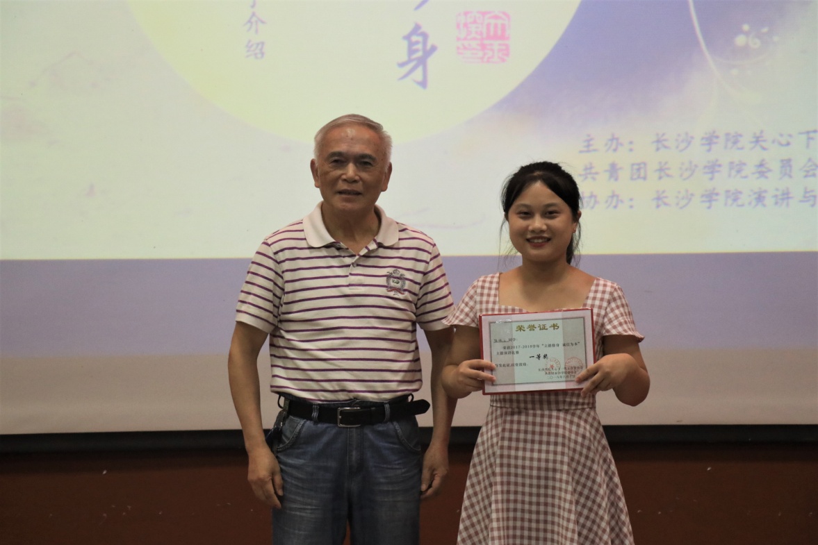 原长沙大学校长、现校关工委常务副主任李峻为一等奖获得者陈佩云颁奖