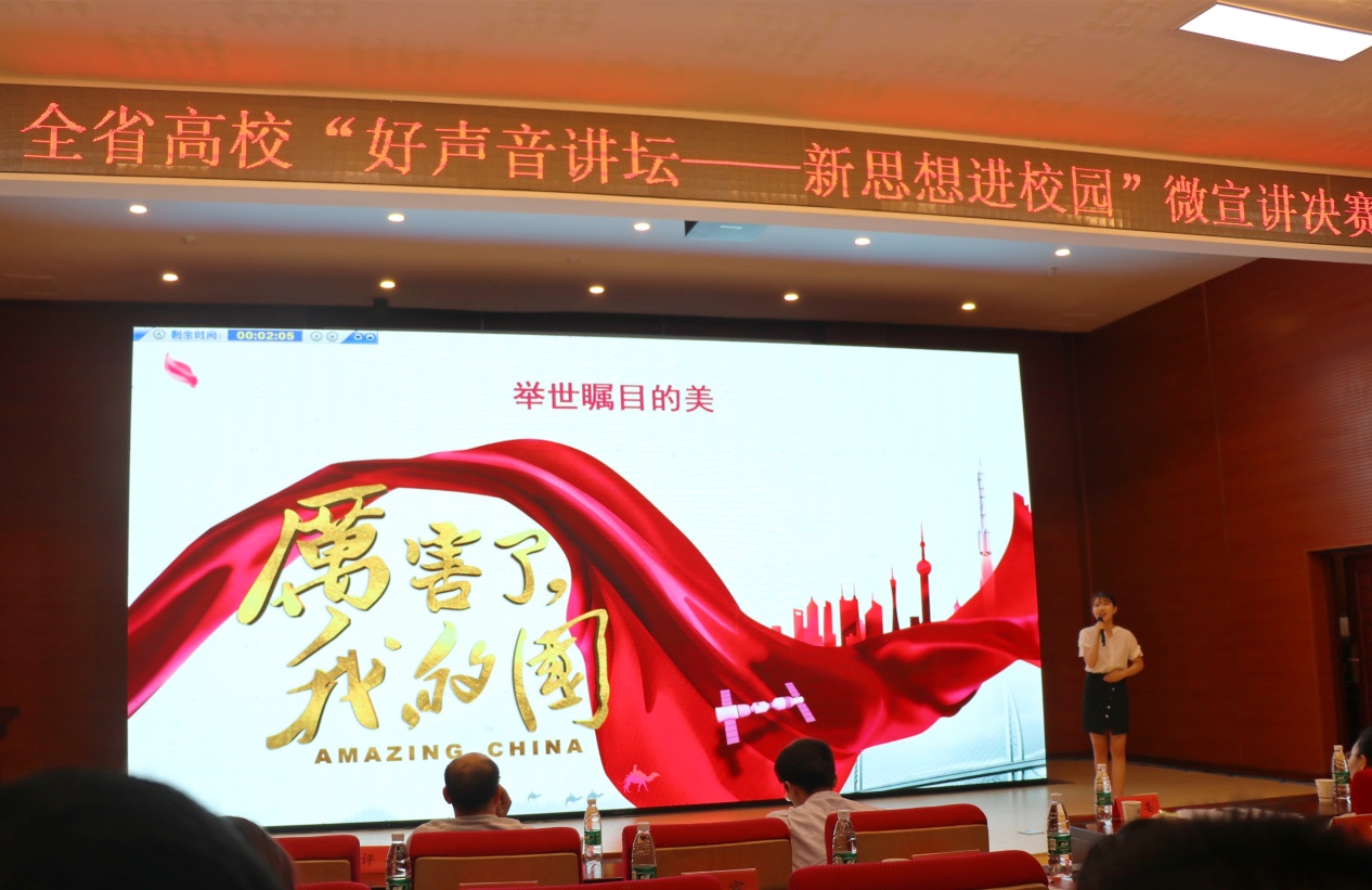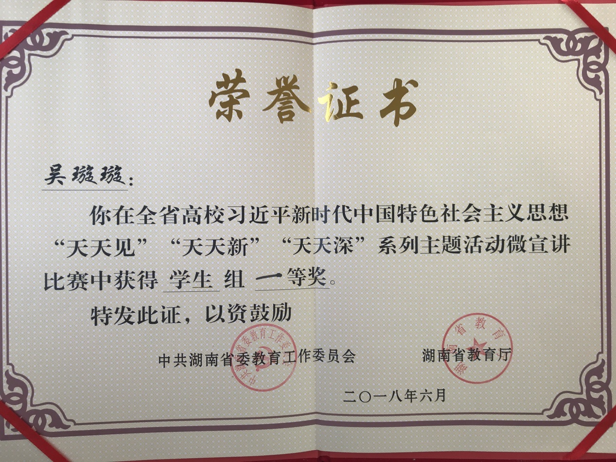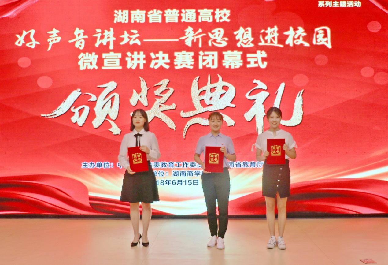 6月15日上午,由省委教育工委、省教育厅主办的全省高校习近平新时代中国特色社会主义思想“天天见”“天天新”“天天深”系列主题活动之“好声音讲坛——新思想进校园”微宣讲决赛在湖南商学院举行。我校外国语学院英语专业16级学生吴璇璇同学与来自中南大学、湖南师范大学等省高校优秀选手同台竞技,获得学生组比赛一等奖。