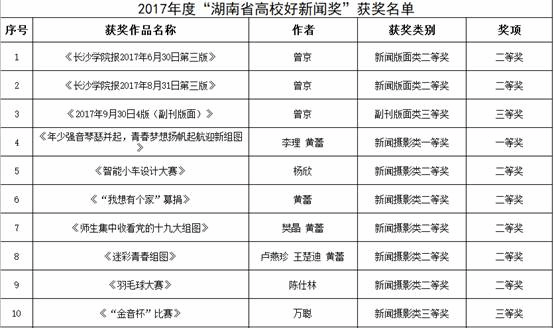 日前,2017年度湖南省高校“优秀校报”、省高校好新闻奖评选活动结果揭晓,我校共有27件作品获得“湖南省高校新闻奖”,其中一等奖作品3件、二等奖作品17件、三等奖作品7件,我校校报编辑部获评湖南省高校“十佳校报编辑部”。