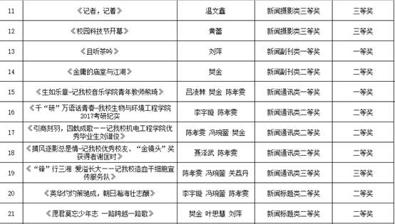 本次获奖作品涉及新闻版面、新闻摄影、新闻标题、消息稿、通讯稿、副刊等类别。其中,陈孝雯、樊金、吕凌棘的通讯类作品《生如乐章——记我校音乐学院青年教师熊琦》,刘萍的副刊类作品《且听茶吟》,李理的新闻摄影类作品《年少强音琴瑟并起,青春梦想扬帆起航迎新图组》三件作品以鲜明的主题、独特的视角、精准的表达荣获“湖南省高校新闻奖”一等奖。