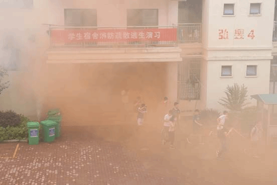 上午8点,工作人员在弘昱四栋二楼、四楼点燃了烟雾弹,大量烟雾弥漫公寓宿舍楼,500余名学生处于“危险”之中。学生发现险情后立即向园区宿管员汇报,宿管员立即一边拨打校园报警电话,一边组织学生有序疏散。保卫处在接到火灾险情报告后,立即启动应急预案,拨打119报警电话;指派安保人员组织学生疏散和灭火抢险;通知校医院医务人员赶赴火灾现场。按照安保人员的指引,学生用湿毛巾捂住口鼻,一一弯着腰从公寓内顺利撤出,整场撤离用时不到2分钟。五分钟后,丝茅冲消防中队的消防车赶到公寓楼下,消防员以最快的速度对“着火点”进行喷水灭火,发现室内还有“被困”学生后,消防员再次进入公寓内,迅速将“被困”学生背出。