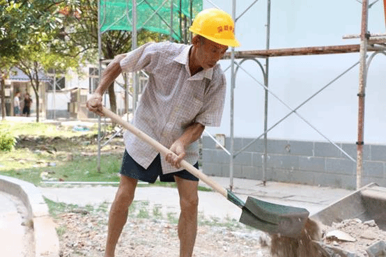 老陈的工作是处理建筑垃圾,主要负责用铁锹把多余的建筑垃圾铲起倒入垃圾车,然后运送人员将垃圾运走。他一点半就已经开始这一工作了,这个时候已经是汗流浃背。