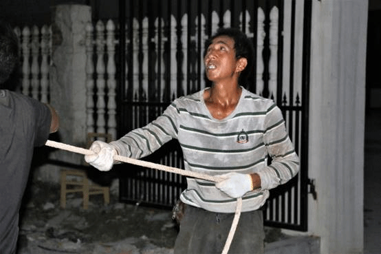 李师傅和几个工友将最后的几大捆建筑钢材利用滑轮,用粗绳将钢材全部运到六楼,他们一天的工作也就结束了。这时已经是晚上8点,气温33℃,体感温度38.6℃。大部分工人已经在宿舍开始整理休息了。