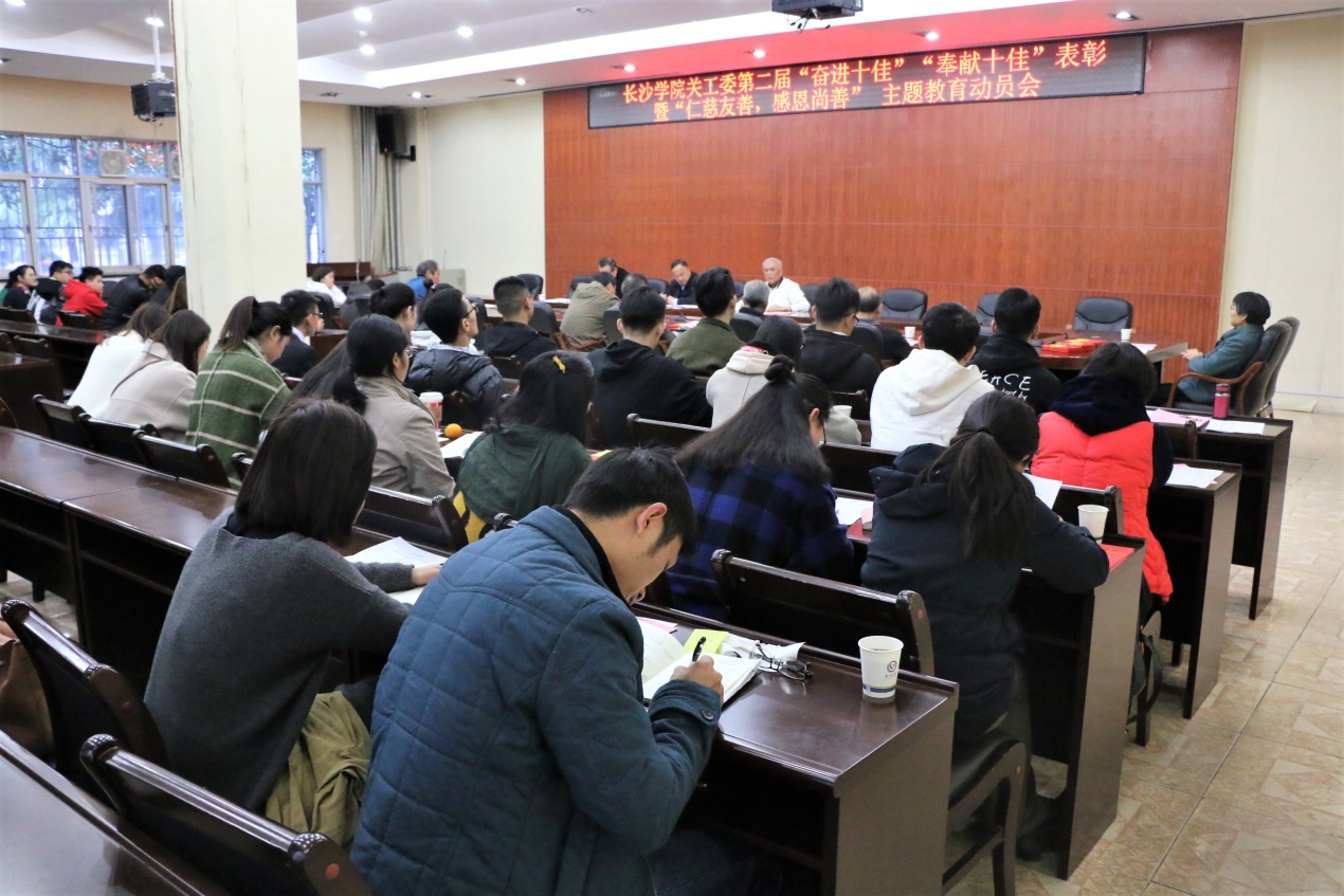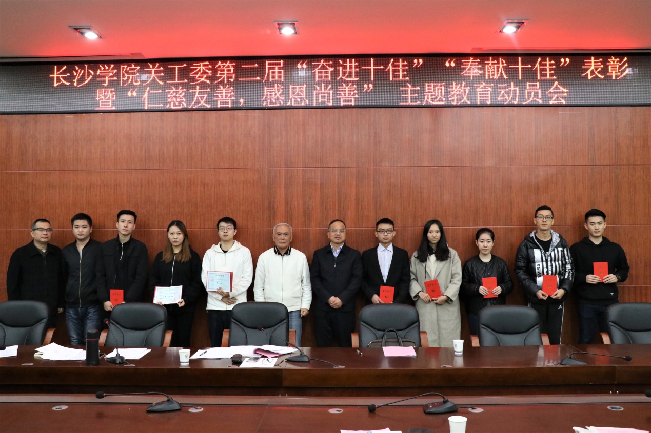 11月8日上午十点,我校关工委第二届“奋进十佳”“奉献十佳”表彰暨“仁慈友善 感恩尚善”主题教育动员会在图书馆一楼会议室召开。党委副书记、校关工委主任屈林岩,原长沙大学校长、关工委常务副主任李峻,长沙学院原党委副书记、现关工委副主任李云龙,关工委全体委员,各二级学院关工委主任、委员及授表彰奖励的学生出席了本次会议。会议由李云龙主持。