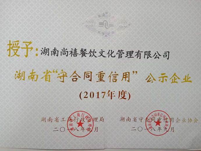 今年9月,湖南省工商行政管理局、湖南省守合同重信用企业协会授予在我校服务的三家餐饮公司(长沙市永景餐饮管理有限公司、长沙市任重餐饮管理有限公司、湖南尚禧餐饮文化管理有限公司)为2017年度湖南省“守合同重信用”公示企业。此外,今年4月,在长沙市食品药品监督管理局组织开展的长沙市餐饮服务单位“食安十佳”评选活动中,我校第一食堂获评2017年度“食品安全管理十佳”学校食堂。