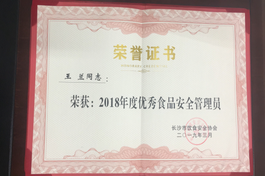 4月8日,长沙市饮食安全协会第三次会员大会暨食品安全管理先进单位表彰大会在湖南省展览馆召开,全省近30家会员单位参会。会议总结了2018年长沙市饮食安全工作情况,并表彰了2018年长沙市食品安全管理先进单位和优秀食品安全管理员。我校被授予“2018年度食品安全管理先进单位”称号,后勤处王兰老师荣获“2018年度优秀食品安全管理员”。