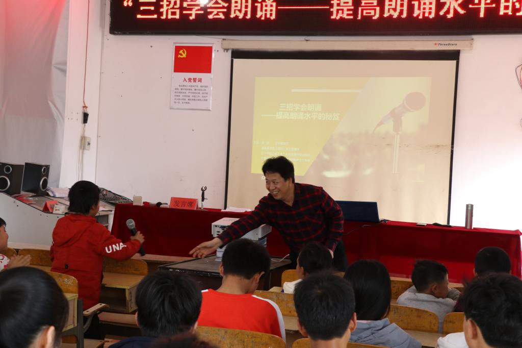 在大安乡乌鸦九年制学校,荣斌老师带来了《三招学会朗诵——提高朗诵水平的秘笈》主题讲座,通过和孩子们一起用想象力和有声语言找鹅、听国旗的飘扬声来朗诵《咏鹅》《国旗的飘扬声》等诗篇,开展沉浸式互动示范教学,帮助该校中小学生和教师代表纠正发音、掌握朗诵技巧。现场40多名中小学生聆听了讲座,沉浸式互动示范教学激发了孩子们的学习兴趣,孩子们争先恐后地朗诵自己学过的诗歌,请求荣斌老师指导。