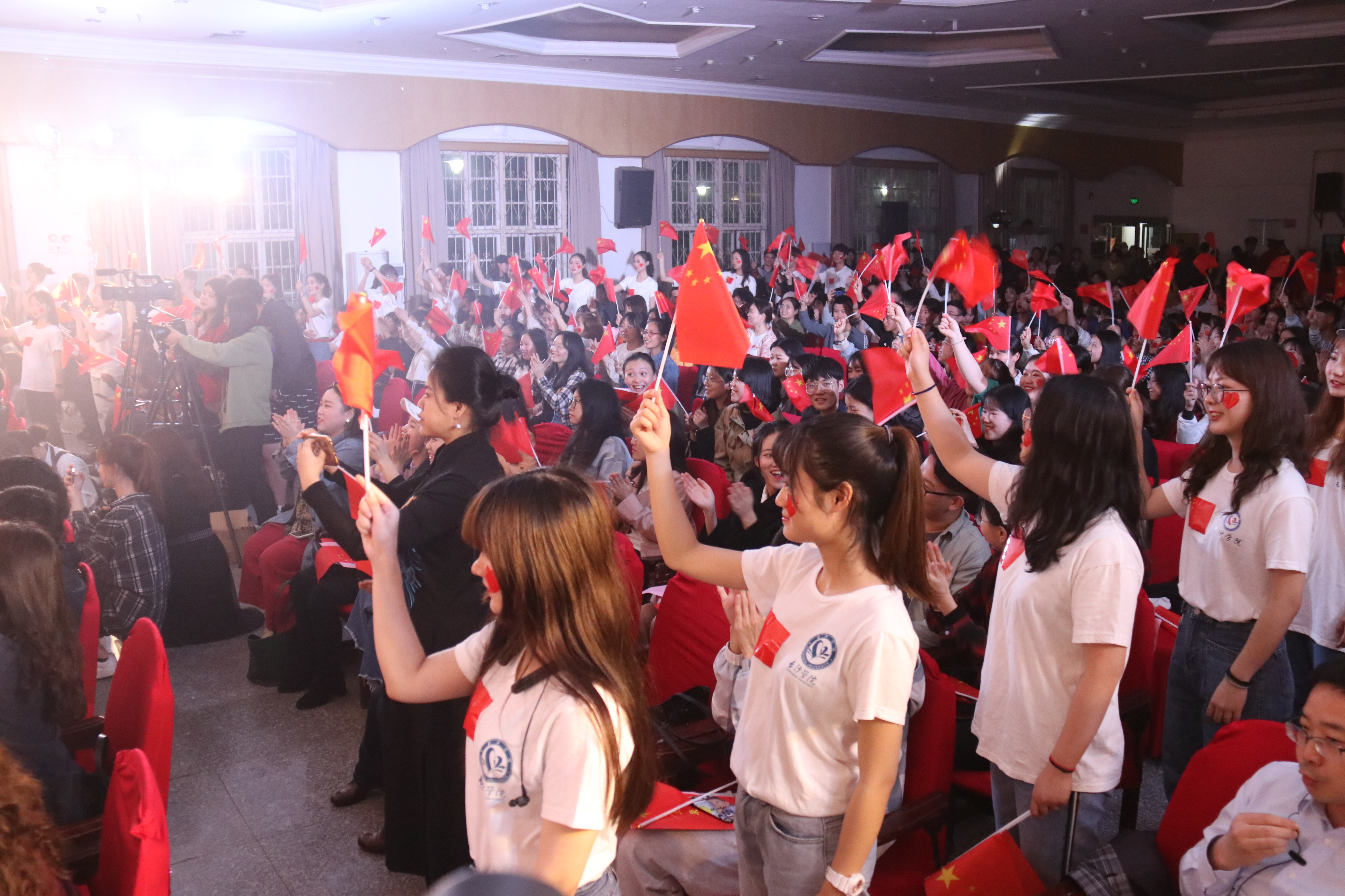 “我和我的祖国,一刻也不能分割……”当追光打向会场各个角落,《我和我的祖国》歌声陆续唱响,师生们从各个方向走上舞台,将对祖国的爱倾注在动情的演唱里。伴随着悦耳的歌声,300多名观众挥动着手中的小国旗,迎接巨幅五星红旗从头顶飘过,掀起了晚会的一轮高潮。