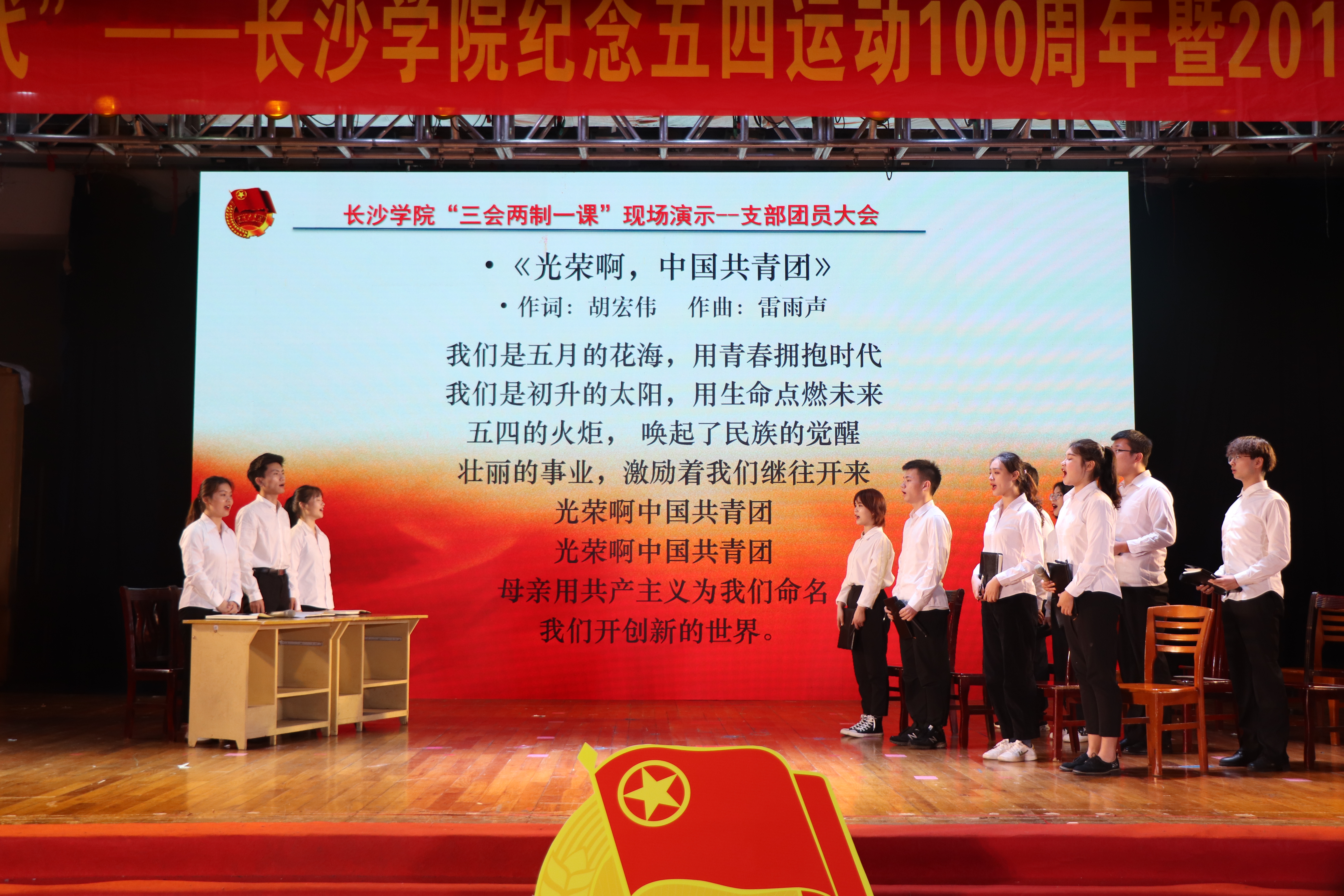 晚会充分展现了我校青年学生的青春之姿。由音乐学院诺亚方舟战队带来的歌曲《青春舞曲》在2018年举办的第四届全国高校“校园好声音”华中区域展示活动中获得第二名的好成绩,并将于本月赴京参加全国嘉年华展演。侗语民歌《多嘎多哪》展示了音乐学院“通道筑梦团”暑期社会实践团队在怀化通道辗转800公里调研侗族音乐文化的实践成果。此外,还有我校第四届体育百炼之星——武术协会带来的武术表演、学生艺术团带来的团支部三会两制一课现场展示以及配乐诗朗诵《中国青年》、合唱《我的祖国》《中国共产主义青年团歌》等精彩节目,赢得了现场观众的阵阵掌声和欢呼声。