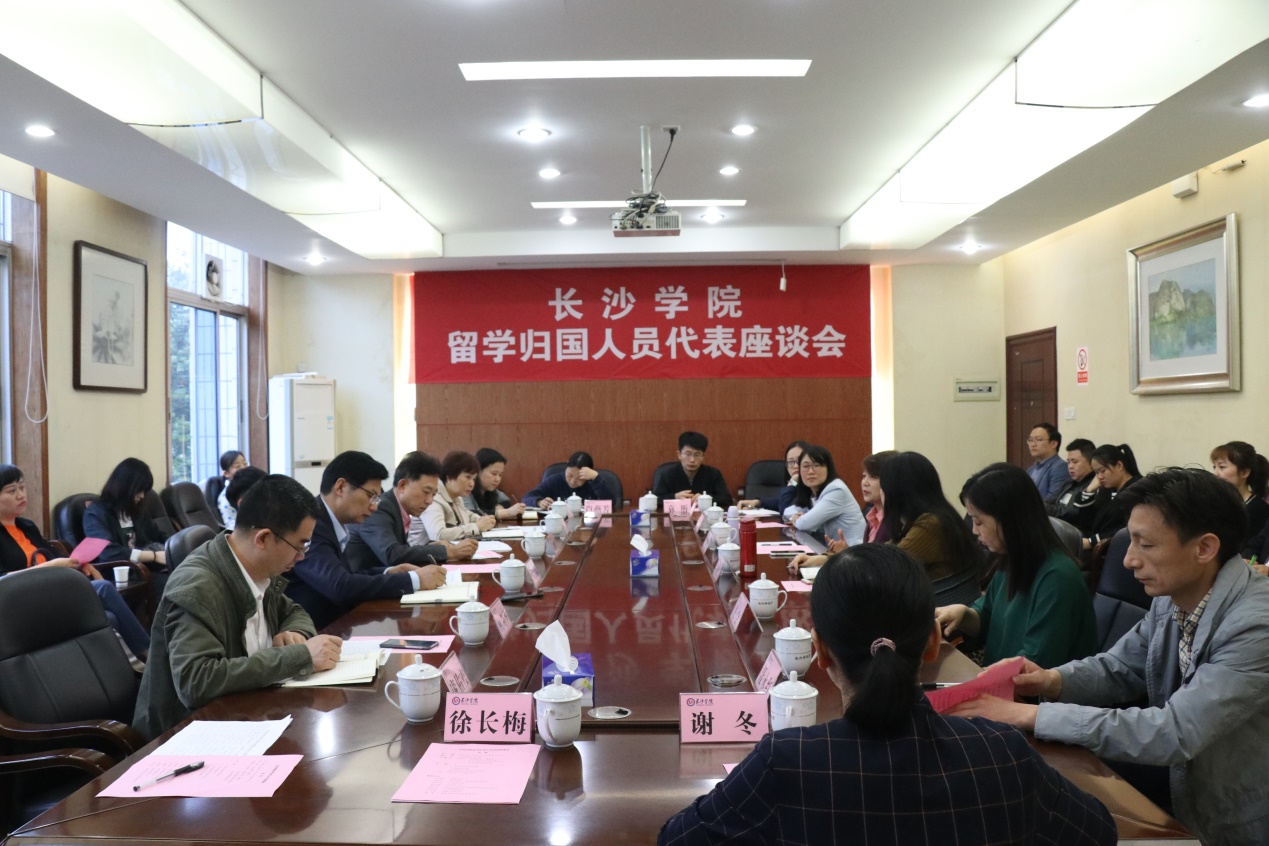 21名留学归国人员代表依次自我介绍,并结合自己在长沙学院工作和生活的经历畅所欲言,为学校的发展建言献策。来自艺术与设计学院的欧阳秋子老师表示,她曾旅居日本11年,刚回国时有过短暂的不适应,是学校对她的关爱和帮助让她有了浓浓的归属感,也让她感受到了家的温暖。 “感谢学校所给的机会,让我有了提升自我,继续成长的机会。”来自外国语学院的谢冬老师表达了对学校的感激之情。谢冬老师2014年9月归国加入长沙学院,几年来笔耕不辍,出版专著1部,在国外期刊发表论文10篇,科研教学两不误,收获了满满当当的成绩和荣誉。“不出国不知道自己这么爱国,不出国不知道自己的祖国原来这么好!”法学院韩晗老师的一席话引起了在场留学归国人员的极大共鸣。其他留学归国人员分别分享了各自的留学经验,表达了自己对祖国的热爱、对学校的感恩以及对未来工作的思考。