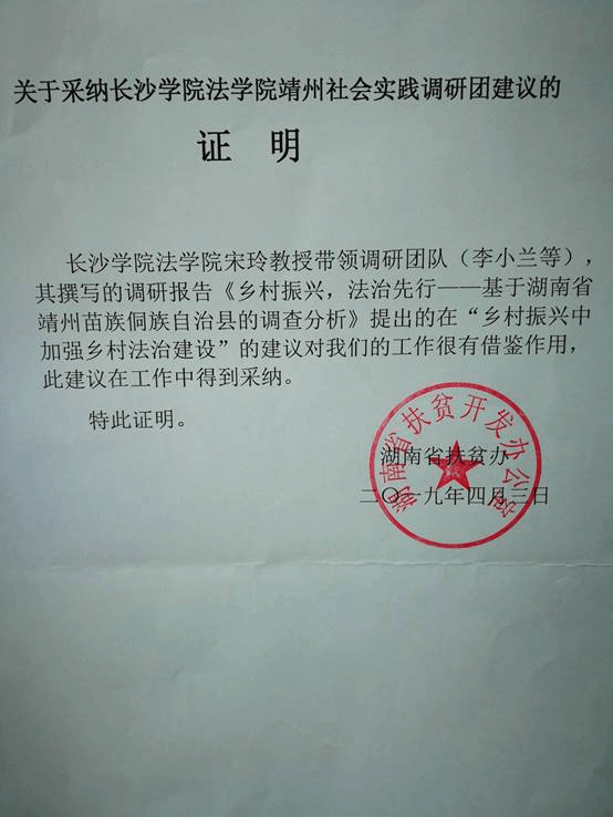 近日,我校法学院副院长宋玲率领调研团队撰写的调研报告《乡村振兴,法治先行----基于湖南省靖州苗族侗族自治县的调查分析》提出“在乡村振兴中加强乡村法治建设”的建议得到政府相关部门采纳。