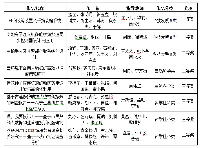 6月2日,由团省委、省教育厅、省经信委、省科技厅、省科协、省学联共同主办的第十三届“挑战杯”湖南省大学生课外学术科技作品竞赛终审决赛在中南林业科技大学落下帷幕。我校共有8项作品入围终审决赛,并获得一等奖2项,二等奖1项,三等奖5项的优异成绩。