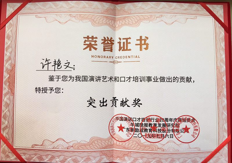 7月6日下午,由羊城晚报报业集团、广东新励成教育科技股份有限公司主办的“致敬时代·讲力未来”中国演讲艺术与口才培训行业20周年庆典在北京梅地亚会议中心举行。会议对多年来为中国演讲艺术与口才培训事业作出贡献的个人和机构负责人进行了表彰,我校许艳文教授荣获“突出贡献奖”。