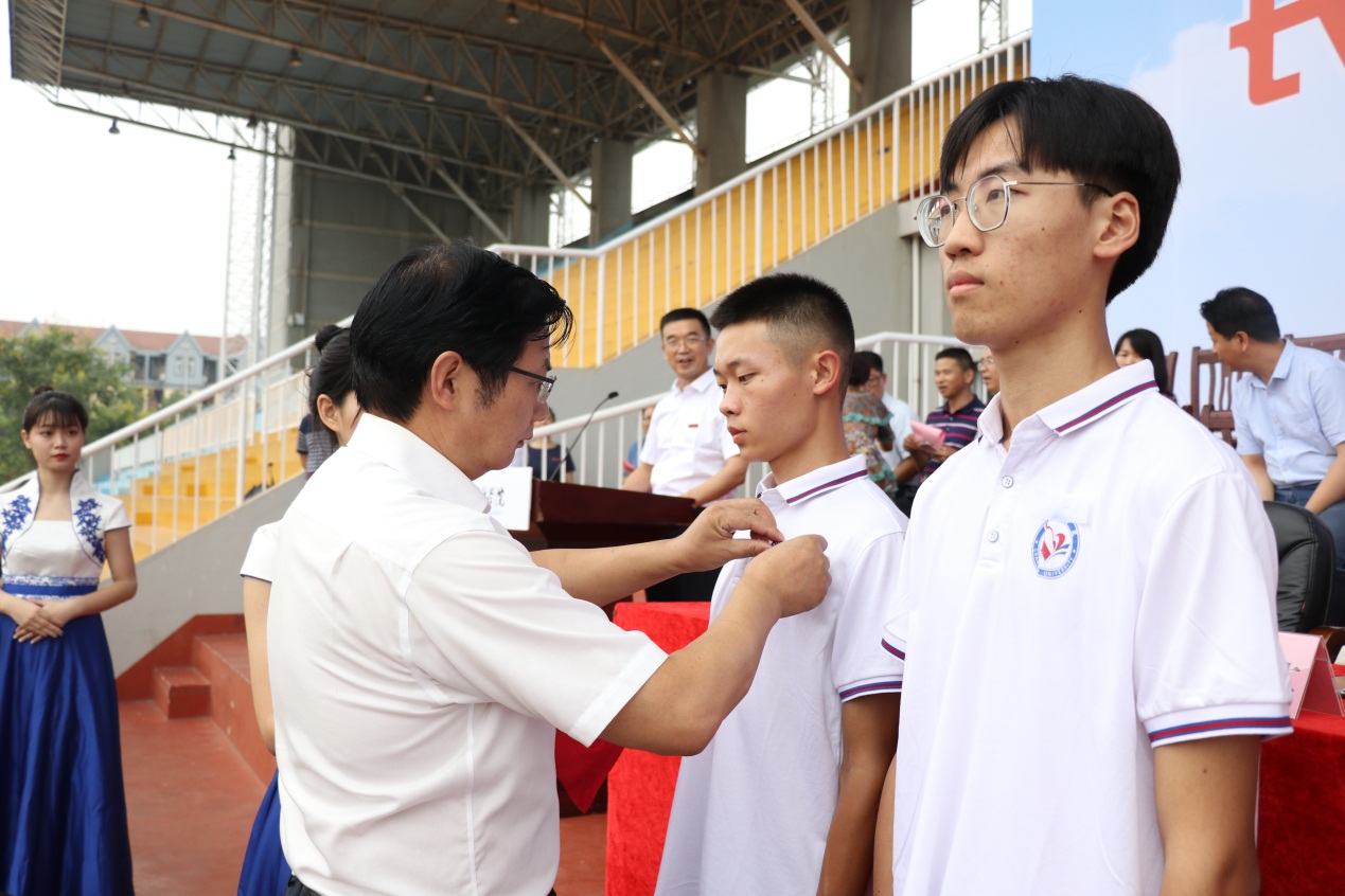 党委书记刘沛林为新生代表佩戴校徽