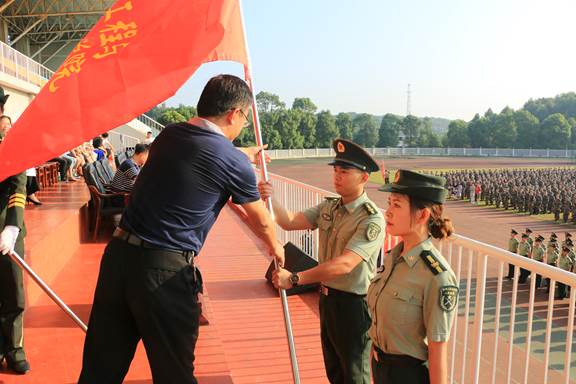 副校长周明侠发表讲话,在向全体自训教员表达衷心感谢和对全体新生亲切慰问后,他就今年军训工作安排强调了四个方面的要求:一是要端正态度,顽强训练,通过军训磨炼坚韧的意志,树立严肃的纪律观念,发扬艰苦奋斗的作风。二是要严格要求,团结合作,在军训过程中领略无私奉献的军人精神,学习不畏艰苦的军人品质,发扬“同心协力,艰苦奋斗”的光荣传统。三是尊重教员,确保安全。同学们在军训过程中要听从指挥,及时反应情况,做好安全防范。四是科学施训,保障到位,各职能部门、各院领导、自训教员等相关人员应各司其职、相互支持,准确掌握学生的思想动态,做好思想工作,从而提高学生参训热情,确保军训顺利进行。最后,他激励参加军训的同学们要不怕吃苦,力争荣誉,以优异的成绩向新中国成立70周年献礼。