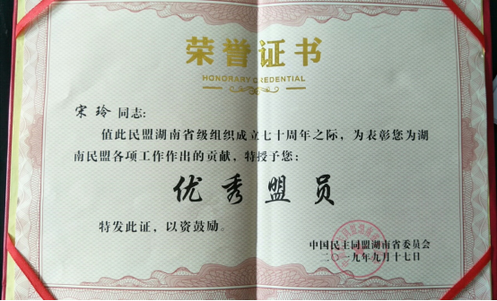 会议对在思想建设、组织建设、参政议政、社会服务、机关建设和本职工作等方面做出重要贡献、成绩突出的集体和个人进行了表彰。经我校民盟支部推选、开福区工委筛选、盟市委机关会议、常委会讨论审核通过后报盟省委,我校民盟支部成员、法学院宋玲老师因在参政议政、服务社会等各方面表现突出,在全省1.2万盟员中脱颖而出,被授予省级“优秀盟员”称号,为学校赢得了荣誉。