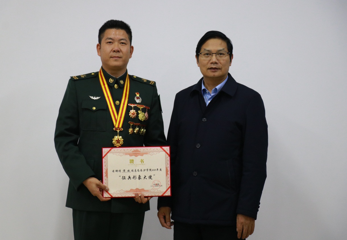谭斌的英雄壮举和精神品质,彰显了新时代军人不忘初心、牢记使命的铁血忠诚。党委书记刘沛林代表学校授予谭斌同志我校“2020年度征兵形象大使”聘书。“了解了谭斌同志的英雄事迹后,我深刻的体会到了‘英雄’两字的分量,我在日常生活中也会向谭斌同志学习,争做新时代好青年。”听完报告会后,法学院学生刘思表示。