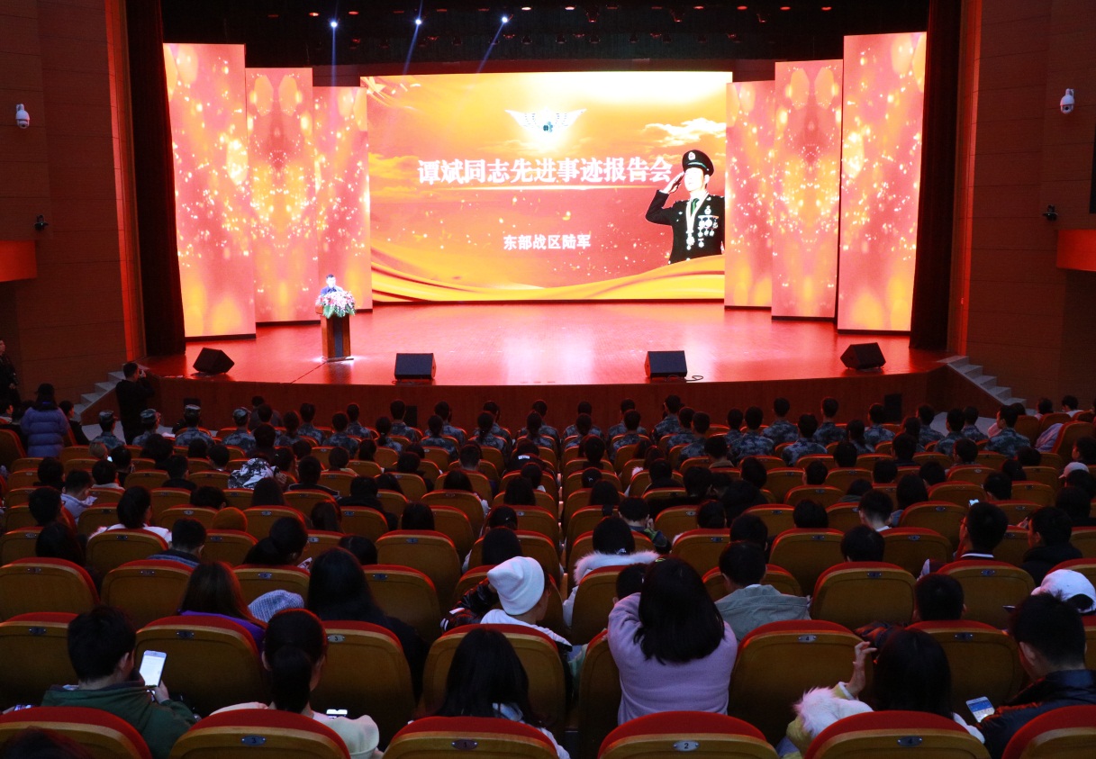 12月24日下午,由省委宣传部和市委宣传部联合主办的谭斌同志先进事迹报告会在我校新礼堂举行。东部战区陆军政治工作部宣传处处长丁广阳,陆军第72集团军政治工作部宣传处处长张愈,我校党委委员、副校长周明侠出席报告会,武装部、团委等相关职能部门负责人参加会议。报告会由周明侠主持。