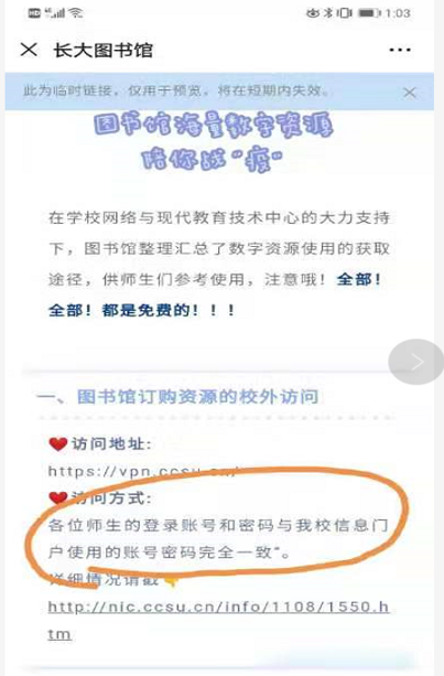 学校因疫情推迟返校报到,为了满足长沙学院师生在疫情期间在校外可以访问知网主要数据库、查找和阅读文献的需求。图书馆整理汇总了数字资源使用的获取途径,免费提供师生们参考使用,网络与现教技术中心负责提供技术支持,为全校师生开通VPN远程访问,登录https://vpn. ccsu.cn,通过个人信息门户账号、密码即可登录学校图书馆数字资源,使用内容和校内访问相同,不受地址的限制,为落实教育部“停课不停学”的指示精神创造了有利条件。